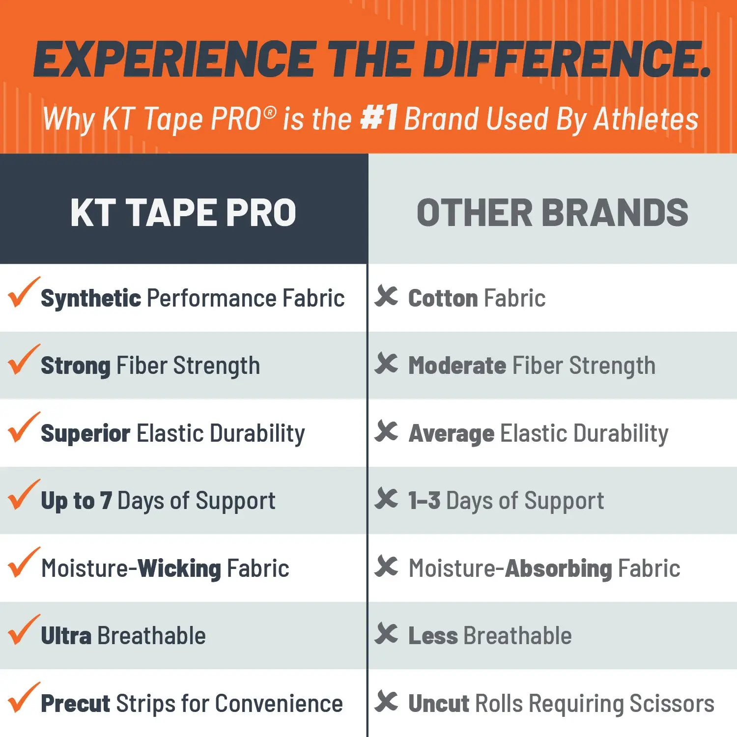 KT Tape Pro® fibers feature a stronger elastic core which delivers better support for muscles, joints and tendons without restricting comfort and range of motion. This improved elastic core retains its elasticity far better over time and provides more durable support than cotton kinesiology tape, lasting as long as you need it. Like top athletes, it relies on both strength and endurance to get the job done.