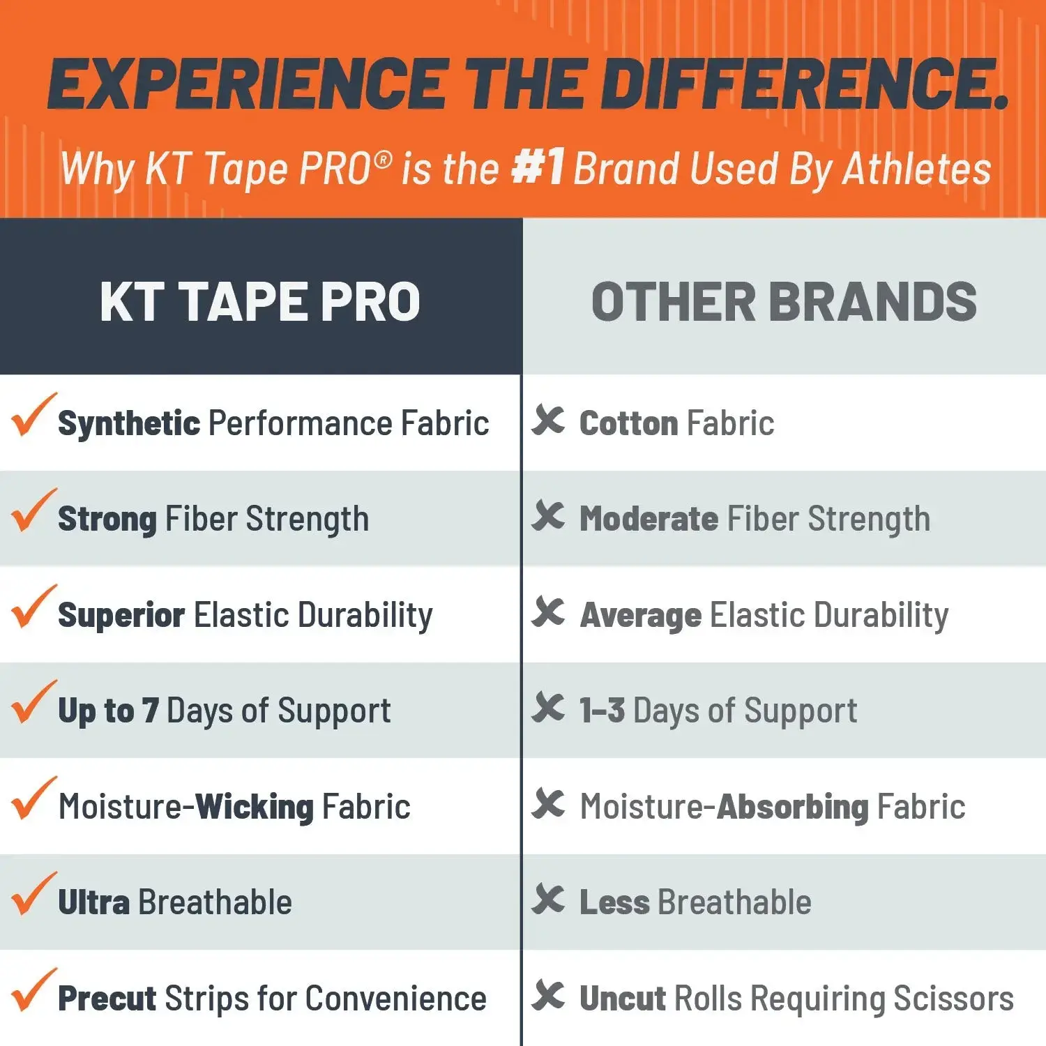 KT Tape Pro® fibers feature a stronger elastic core which delivers better support for muscles, joints and tendons without restricting comfort and range of motion. This improved elastic core retains its elasticity far better over time and provides more durable support than cotton kinesiology tape, lasting as long as you need it. Like top athletes, it relies on both strength and endurance to get the job done.